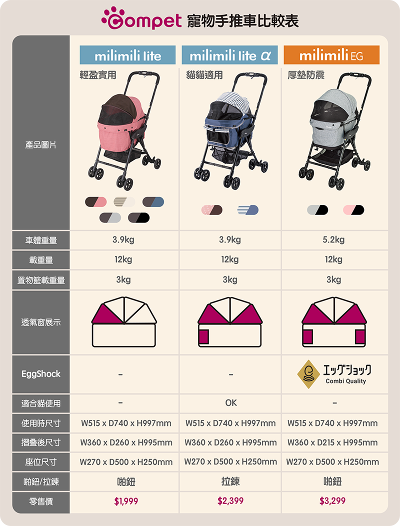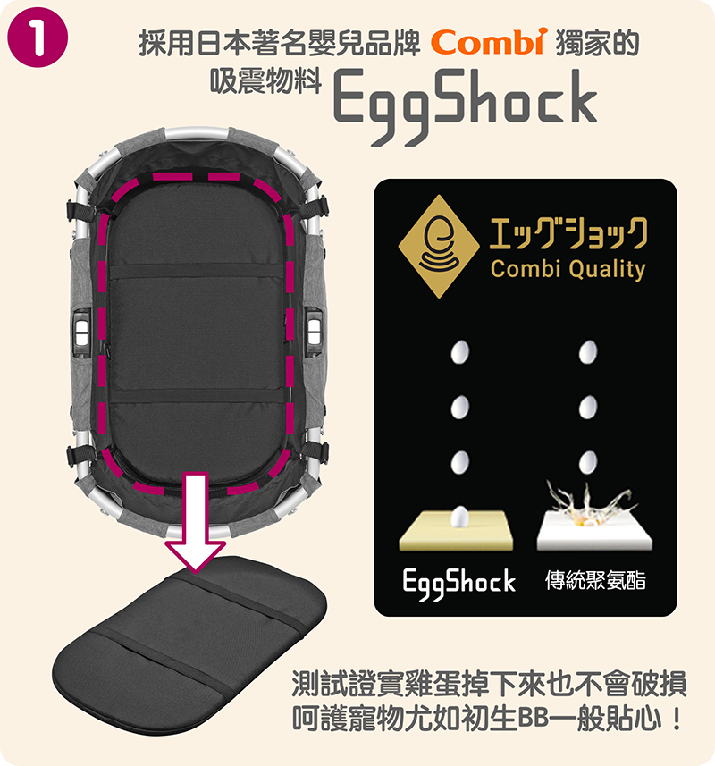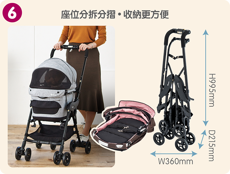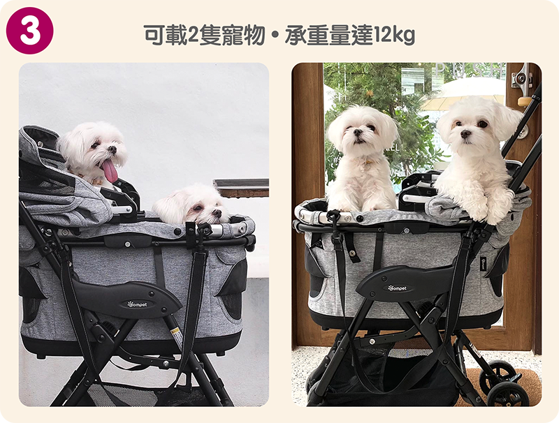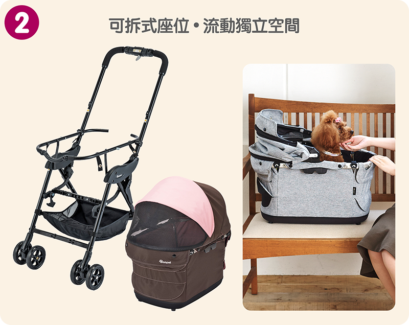座位加長加厚,更比照嬰兒手推車的避震設計,提供前後減震系統,讓愛寵乘坐更舒適。