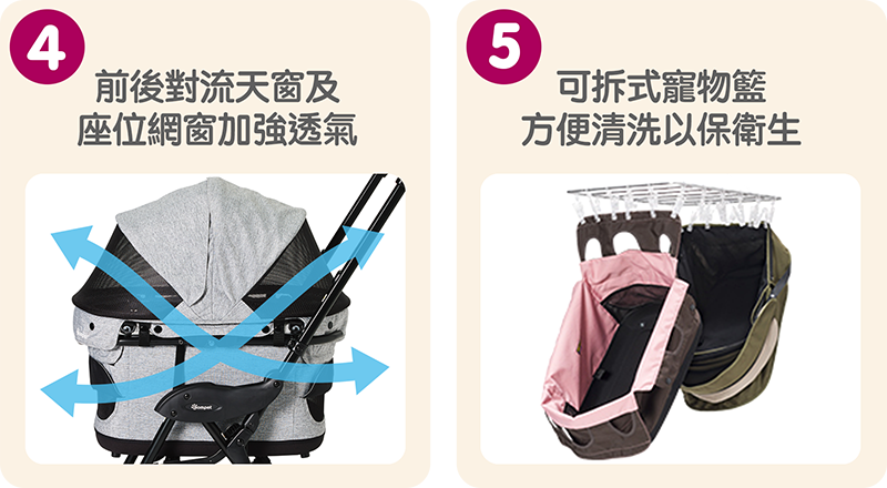 遮陽罩前後和寵物箱前方共4處網狀天窗設計,提供絕佳通風環境。
