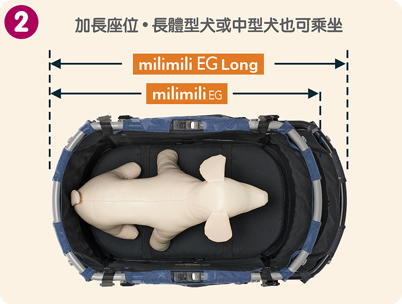 加長尺寸,長體型狗(例如臘腸、科基)也能輕鬆使用,中型犬也可乘坐。