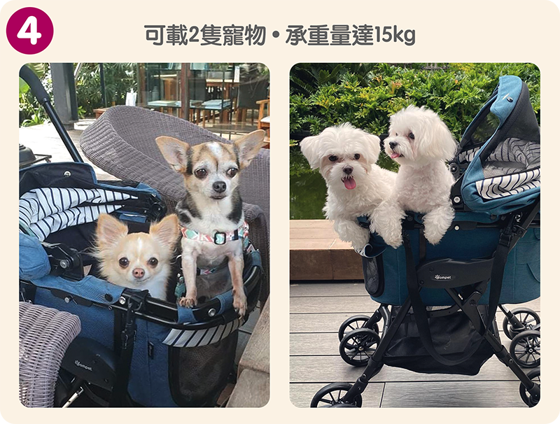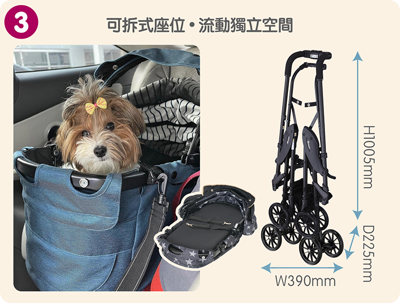 座位加長加厚,更比照嬰兒手推車的避震設計,提供前後減震系統,讓愛寵乘坐更舒適。