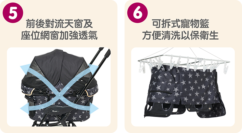 遮陽罩前後和寵物箱前方共4處網狀天窗設計,提供絕佳通風環境。