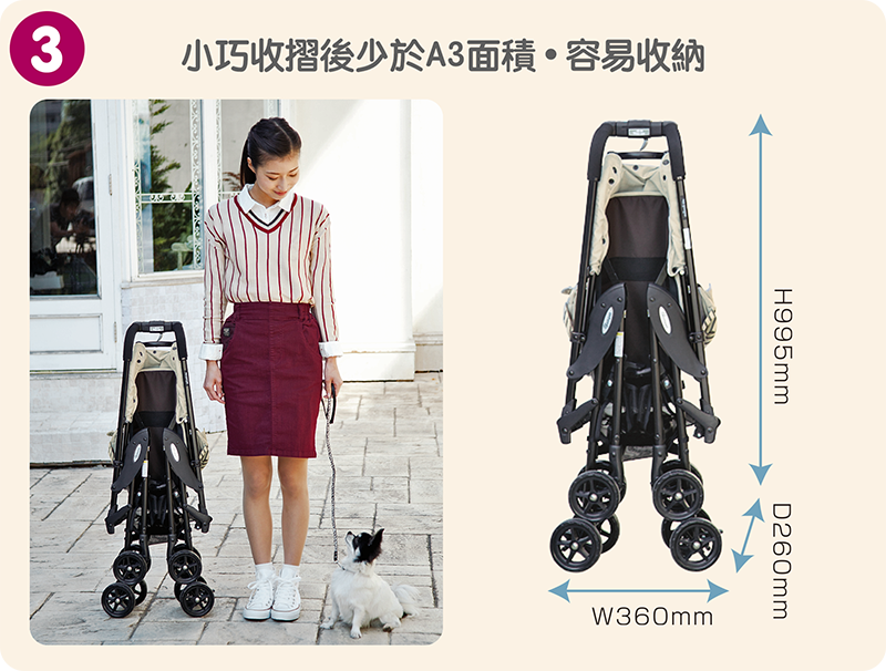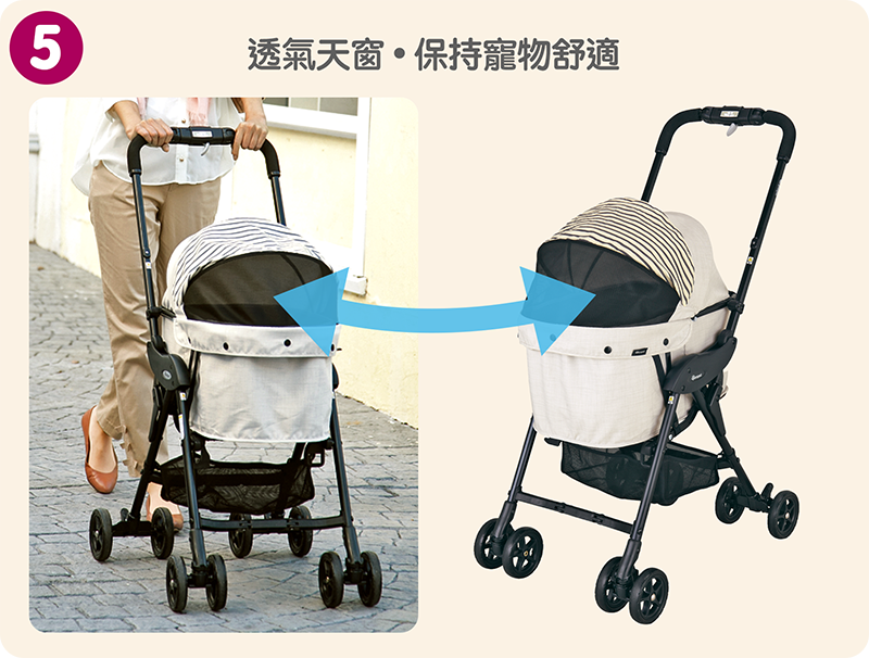 比照嬰兒手推車的避震設計,提供前後減震系統,讓愛寵乘坐更舒適。