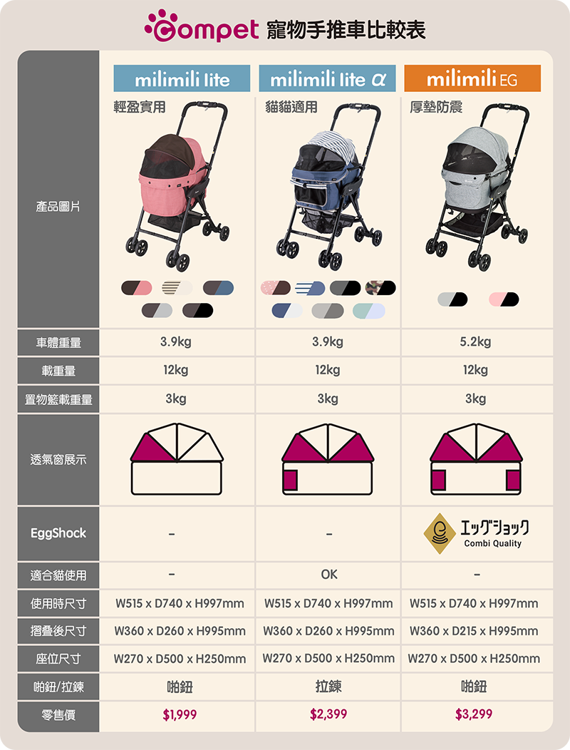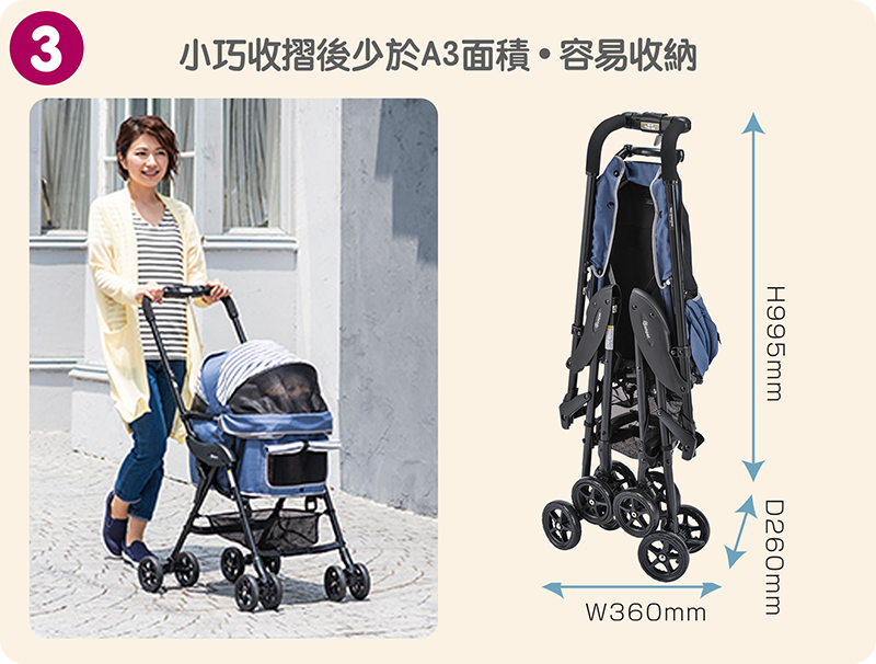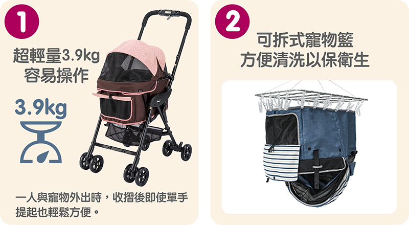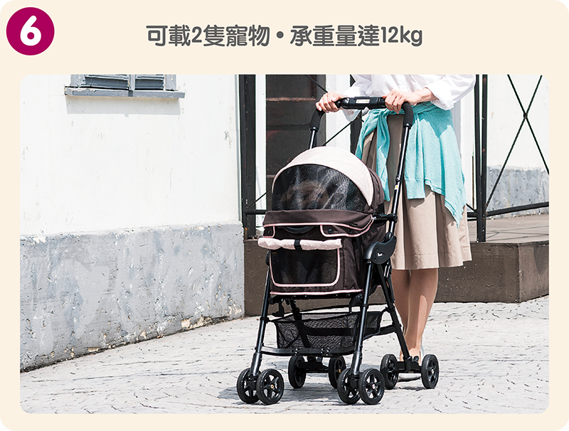 比照嬰兒手推車的避震設計,提供前後減震系統,讓愛寵乘坐更舒適。