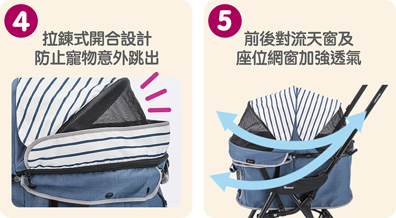 遮陽罩前後和寵物箱前方共三處網狀天窗設計,提供絕佳通風環境。